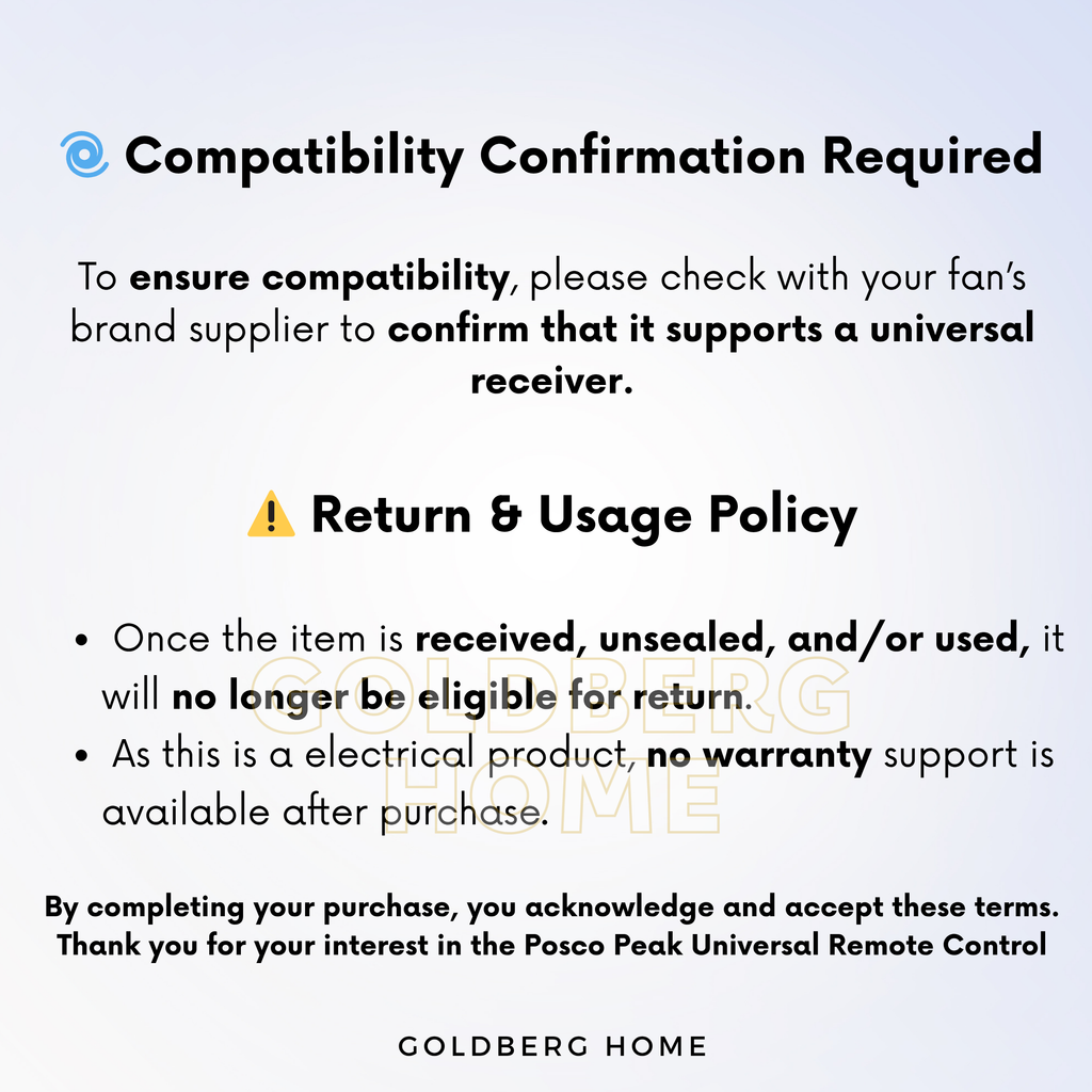 • Universal remote controller to replace your existing controller • 3 different speed setting: Low, Medium, High • Timer setting: 1,2,4,8hours • On/off control for fan and light • Power Range 200~240V Max.